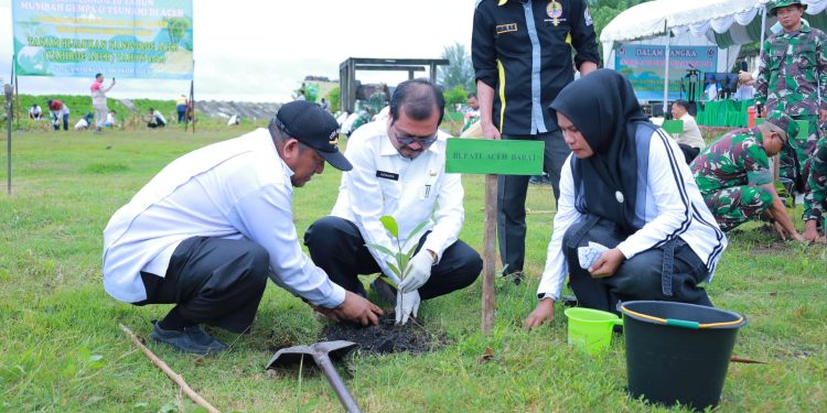 MEULABOH | BARATNEWS.CO – Pj Bupati Aceh Barat, Azwardi, melakukan penanaman bibit pohon dalam rangka memperingati 20 tahun musibah gempa dan tsunami Aceh. Aksi tanam pohon ini bagian dari program Tanam Hijaukan Nanggroe (Tahiroe) Aceh.