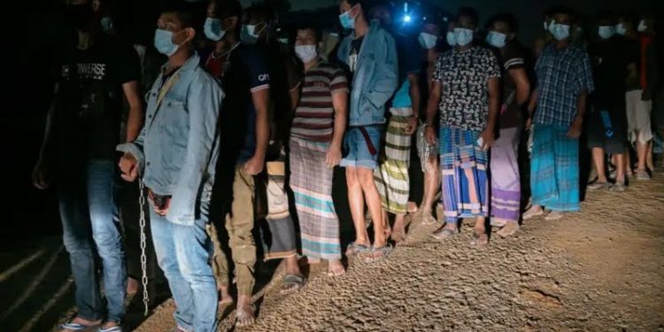 Ilustrasi para pekerja migran yang diketahui tidak memiliki dokumen diperiksa dan diminta berdiri secara berderet oleh petugas Imigrasi Malaysia, 21 Juni 2021. Foto: Zahim Mohd/Getty