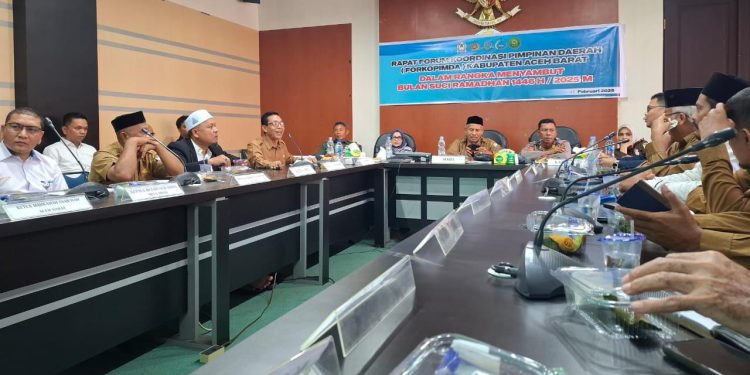 MEULABOH | BARATNEWS.CO – Menjelang datangnya bulan suci Ramadhan 1446 H/2025 M, Forum Koordinasi Pimpinan Daerah (Forkopimda) Aceh Barat menggelar rapat koordinasi dengan unsur terkait di Ruang Rapat Bupati, Selasa (25/2/2025).