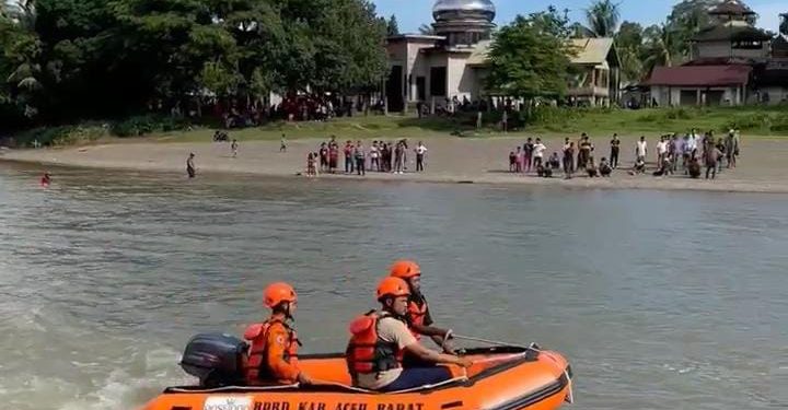 Pencarian korban diduga tenggelam di sungai Krueng Meureubo. Foto: Tangkap layar vidio