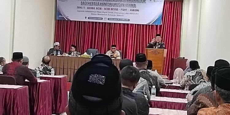 BANDA ACEH | BARATNEWS.CO – Kantor Wilayah (Kanwil) Kementerian Agama (Kemenag) Provinsi Aceh menggelar acara Pembinaan Administrasi Pencatatan Nikah dan Rujuk (NR). Acara ini menyasar untuk memberikan pembinaan kepada Kepala Kantor Urusan Agama (KUA) di beberapa kabupaten/kota.