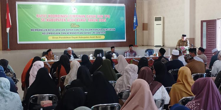 MEULABOH | BARATNEWS.CO – Bupati Aceh Barat, diwakili oleh Asisten Administrasi Umum, Nyak Na, membuka Rapat Koordinasi Para Pimpinan Dayah dan Taman Pendidikan Al-Quran (TPQ) se-Kabupaten Aceh Barat, di Aula Gedung B Dinas Pendidikan dan Kebudayaan, Selasa (29/4/2025).