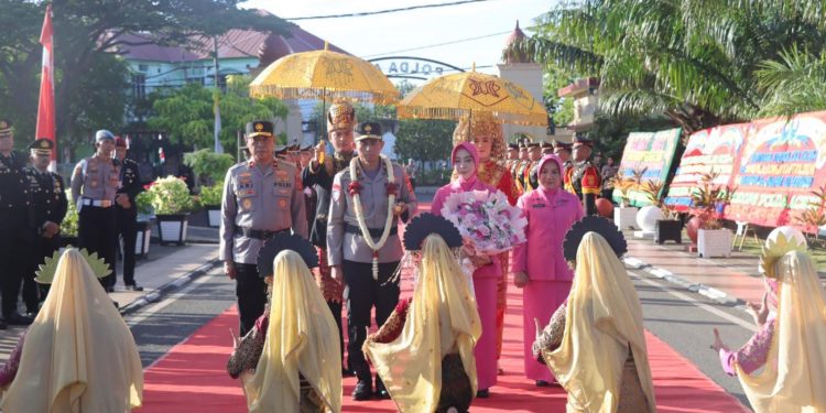 BANDA ACEH | BARATNEWS.CO — Kapolda Aceh yang baru, Brigjen Pol Drs Marzuki Ali Basyah, bersama istri Ny Irawati Marzuki tiba di Mapolda Aceh. Kehadiran keduanya disambut hangat dengan tarian Ranup Lampuan, Sabtu (23/8/2025).