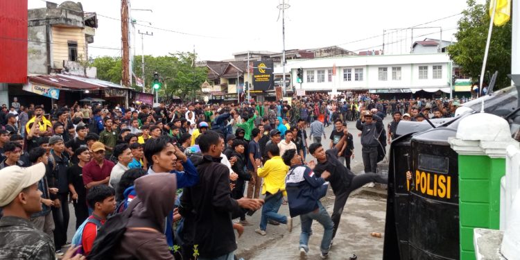 Aksi dorong-mendorong antara mahasiswa dan aparat kepolisian pun tak terhindarkan. Bentrokan pecah, hingga aparat akhirnya memukul mundur massa menggunakan gas air mata dan dua unit water cannon.