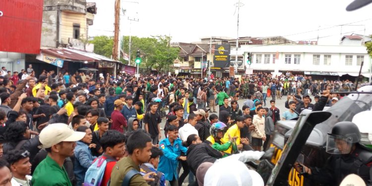 MEULABOH | BARATNEWS.CO — Aksi unjuk rasa ribuan mahasiswa dan masyarakat di halaman Kantor DPRK Aceh Barat pada Senin (1/9/2025) berakhir ricuh setelah aparat kepolisian membubarkan massa dengan water cannon dan gas air mata.