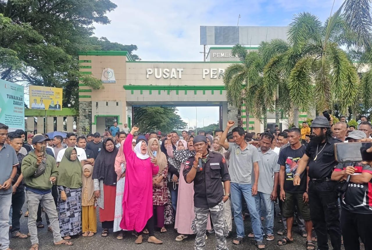 Aksi massa berlangsung di gerbang Lueng Baro menuju kompleks perkantoran Suka Makmue, Sabtu (4/10/2025). Dalam orasinya, para penambang meminta agar aktivitas tambang rakyat yang belum berizin tidak serta-merta dihentikan.