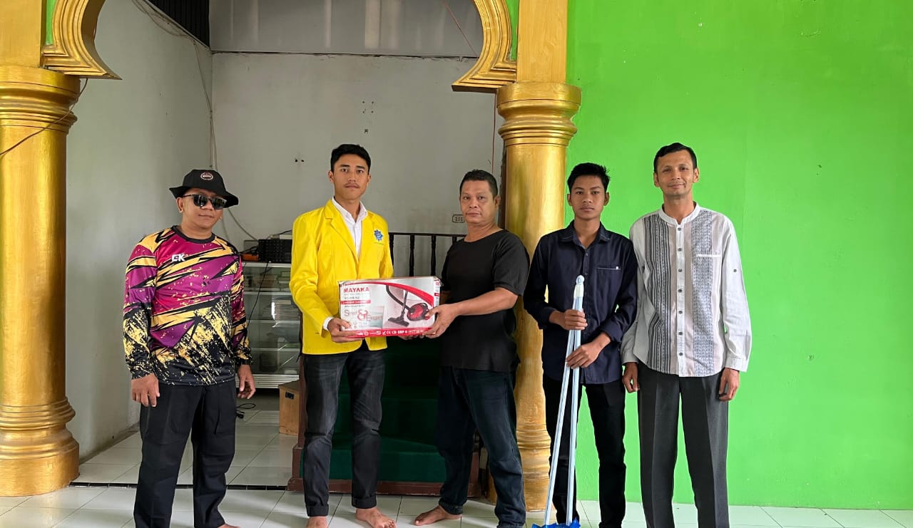 Mahasiswa terlibat dalam gotong royong membersihkan lingkungan masjid dan menyerahkan bantuan berupa mesin penyedot debu (vacuum cleaner) serta alat kebersihan kepada pengurus masjid.