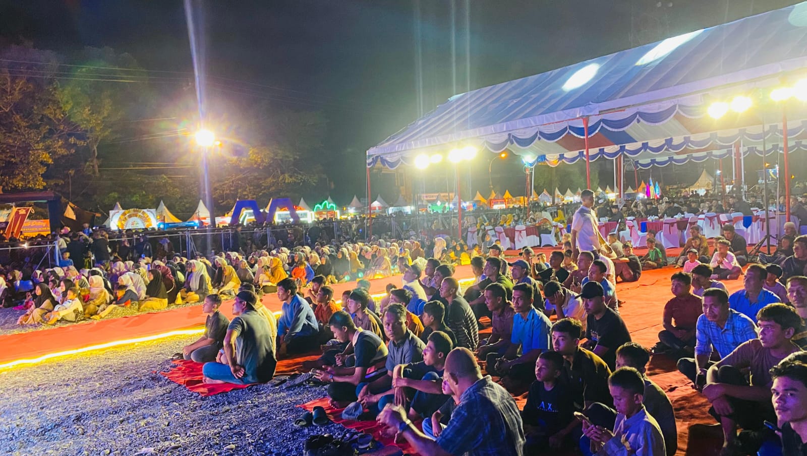 Di panggung utama, pertunjukan musik dan komedi Aceh berlangsung meriah dan tertib. Penonton tampak duduk terpisah antara laki-laki dan perempuan, mencerminkan penerapan nilai-nilai syariat Islam yang harmonis dengan suasana budaya lokal.