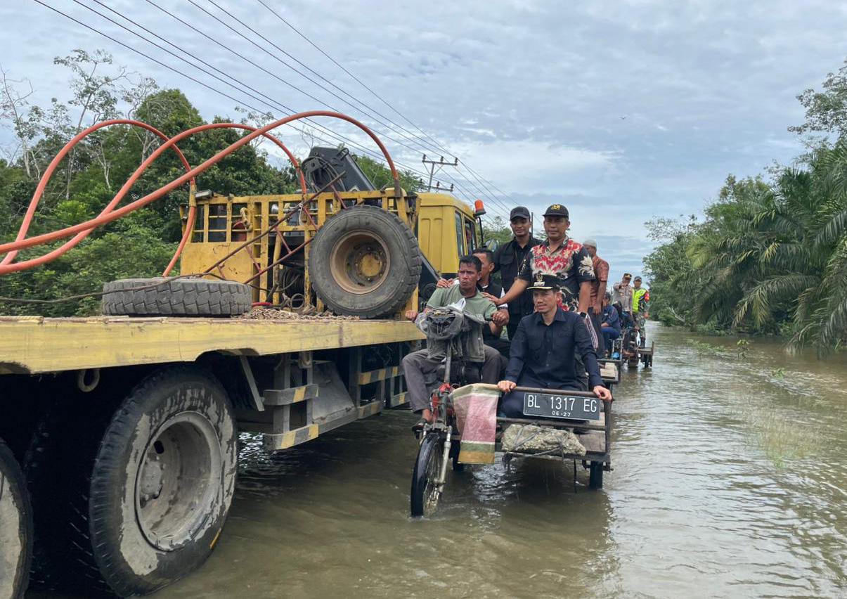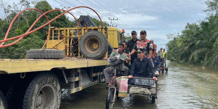 Dalam perjalanan menuju lokasi, rombongan Bupati terpaksa menggunakan becak motor yang dimodifikasi saat melintasi Jalan Ateung Teupat. Jalur tersebut masih tergenang dan tak bisa dilalui kendaraan roda empat akibat tingginya genangan air pascahujan deras.