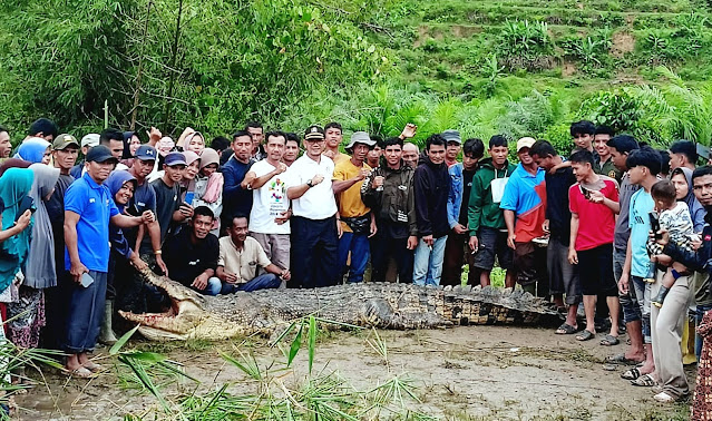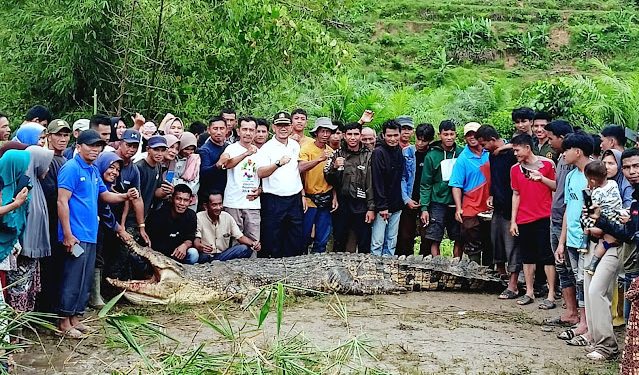 Dalam sejumlah video dan foto amatir yang beredar, tampak seekor buaya berukuran besar diperkirakan sepanjang sekitar enam meter dengan lebar hampir satu meter berhasil dilumpuhkan dan diseret ke daratan oleh warga.