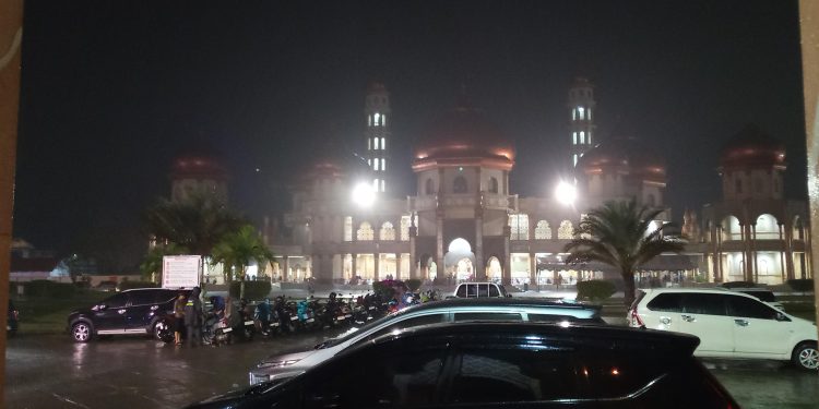 Guyuran hujan yang turun cukup deras pun membuat sejumlah ruas jalan tergenang air. Meski begitu, tidak menjadi penghalang bagi masyarakat untuk menggerakkan kakinya menuju masjid kebanggaan warga kabupaten tersebut.