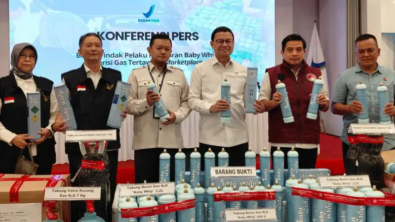 JAKARTA | BARATNEWS.CO – Badan Pengawas Obat dan Makanan bersama Kepolisian Negara Republik Indonesia mengambil langkah tegas terhadap peredaran ilegal gas dinitrogen monoksida (N₂O) yang dijual bebas secara daring dengan merek Baby Whip.