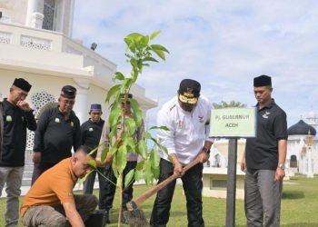 BANDA ACEH | BARATNEWS.CO - Pj Gubernur Aceh, Dr Safrizal ZA, melakukan penanaman pohon jeumpa dan seulanga di halaman Masjid...